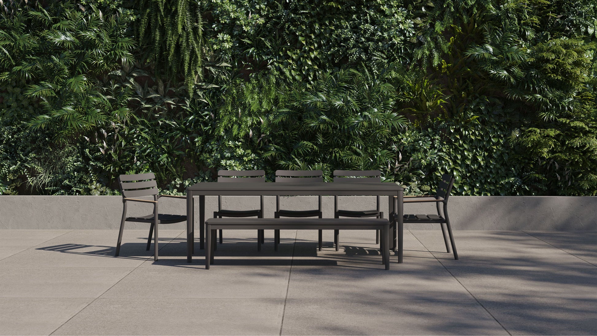 Table de salle à manger rectangulaire d'extérieur en aluminium + 2 fauteuils 595 + 3 chaises sans accoudoirs 595 + banc de salle à manger en aluminium