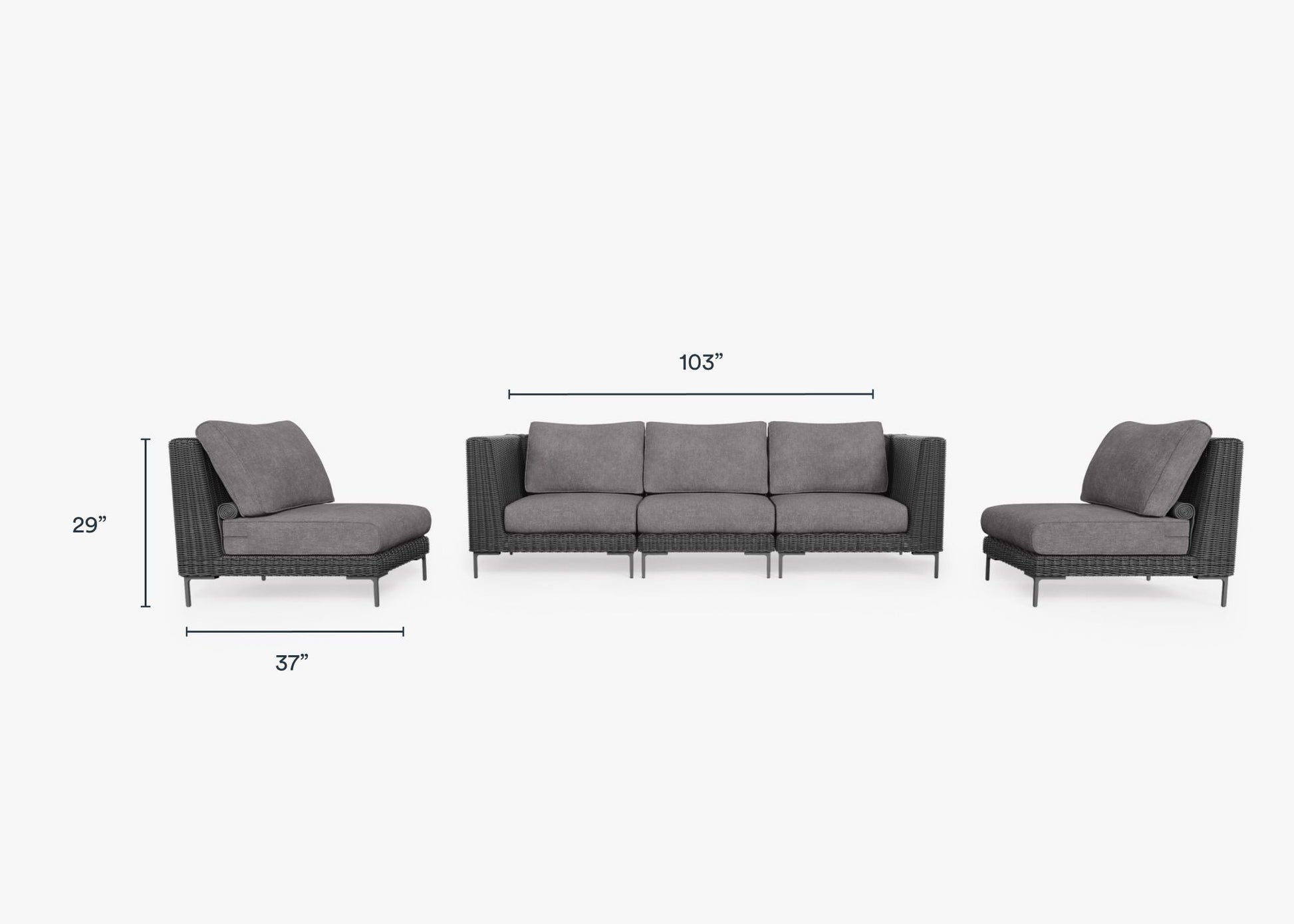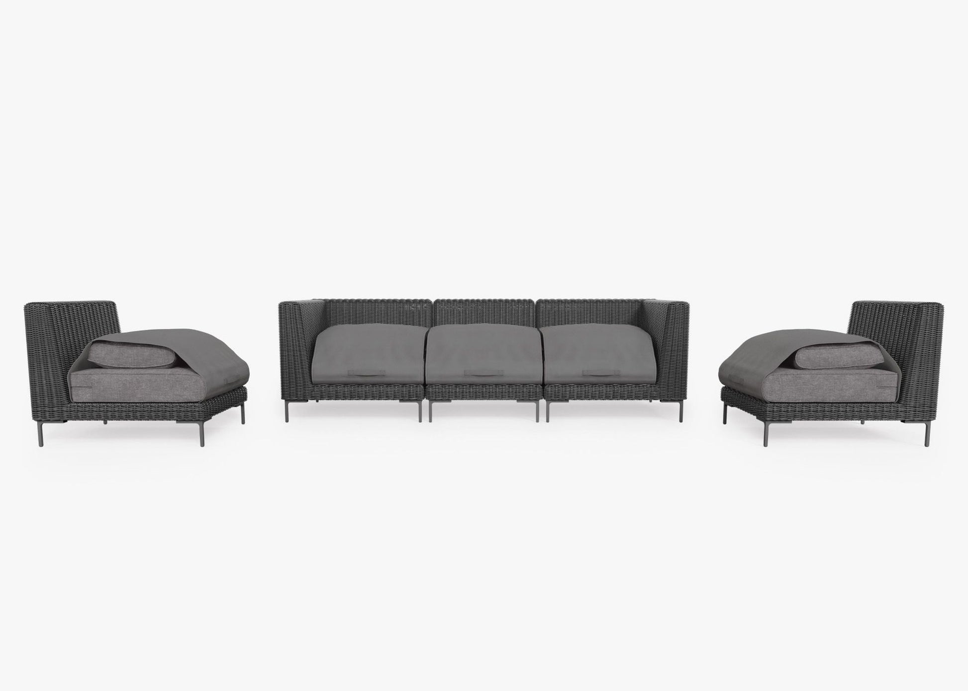 Canapé d'extérieur en résine tressée noire avec fauteuils sans accoudoirs - 5 places