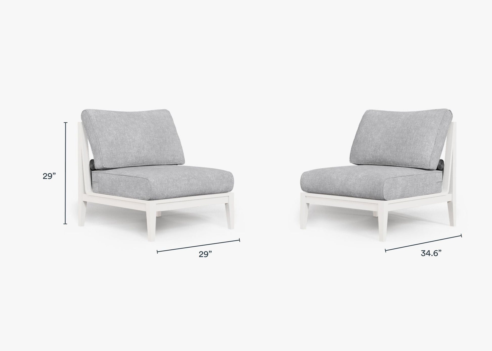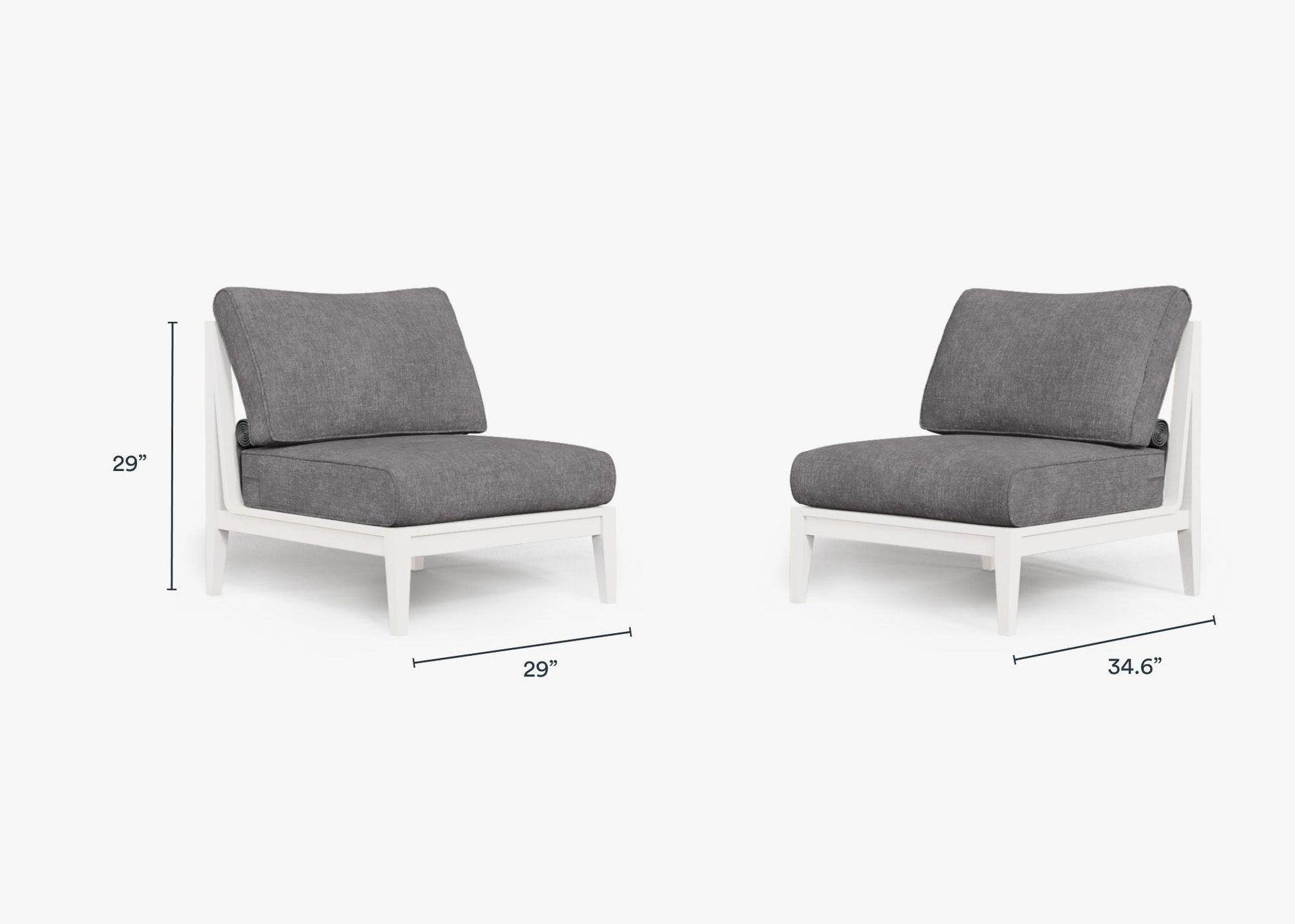 Profitez du confort de votre intérieur en extérieur. Élégant, léger et conçu pour durer grâce à sa structure en aluminium résistant aux intempéries, le mobilier modulaire Outer vous invite à la détente sur des coussins en mousse à mémoire de forme d'un confort exceptionnel. La housse OuterShell® intégrée et facile à utiliser protège les coussins lorsqu'ils ne sont pas utilisés. Elle est dotée d'une fermeture Velcro pour la maintenir en place et d'une poignée pour un transport et un rangement aisés. Aucun assemblage requis. Comprend 2 fauteuils sans accoudoirs pouvant être réunis en un canapé deux places.