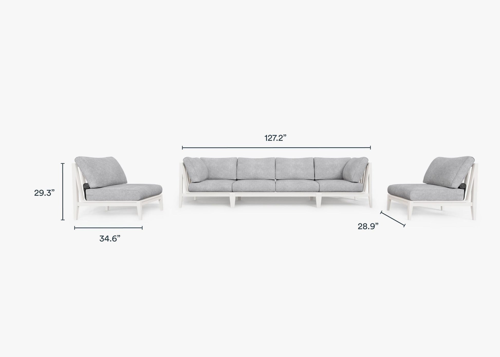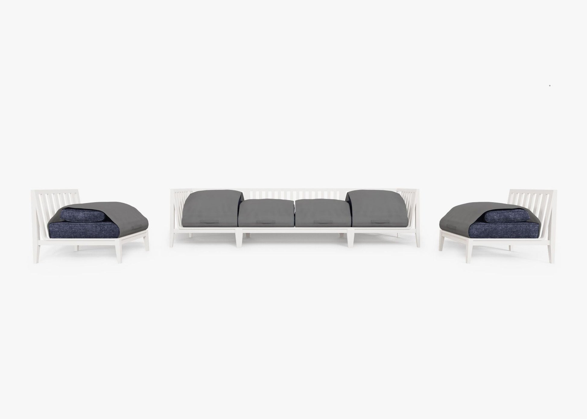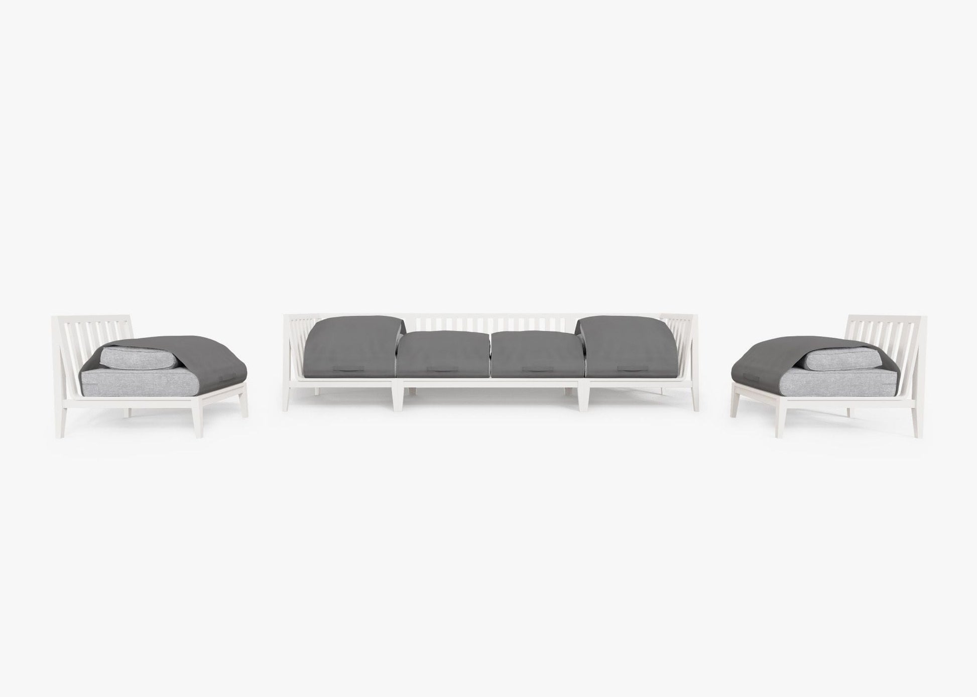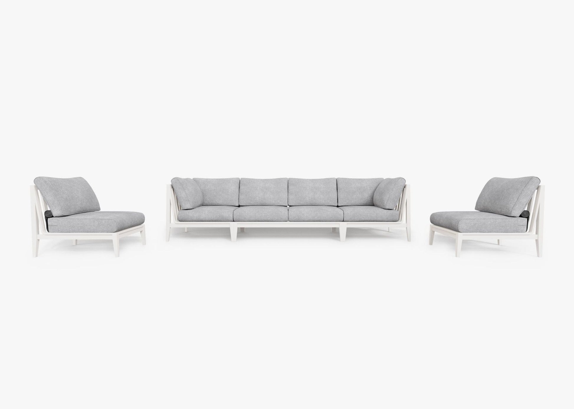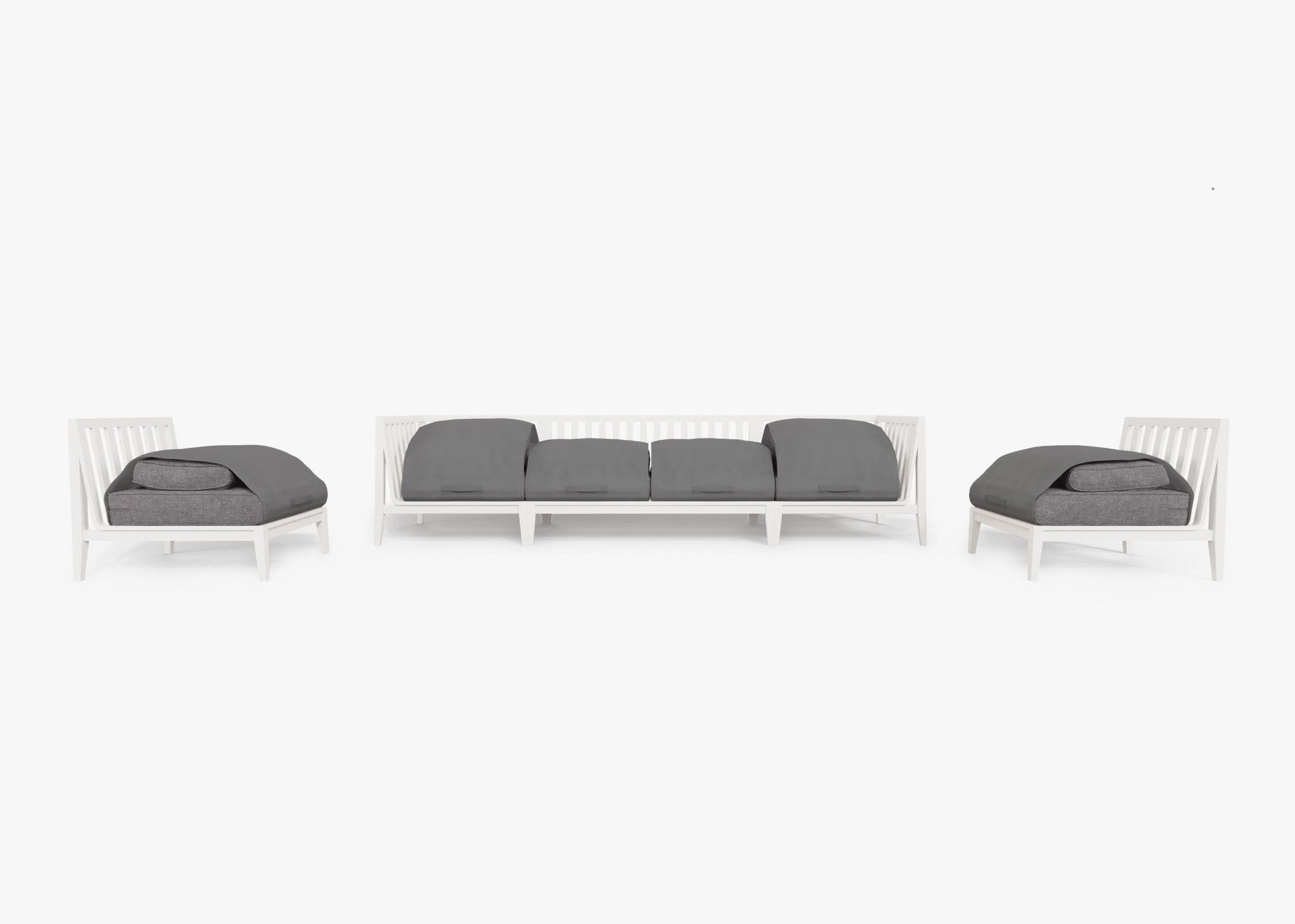 Profitez du confort de votre intérieur en extérieur. Élégant, léger et conçu pour durer grâce à sa structure en aluminium résistant aux intempéries, le mobilier modulaire Outer vous invite à la détente sur des coussins en mousse à mémoire de forme d'un confort exceptionnel. La housse OuterShell® intégrée et facile à utiliser protège les coussins lorsqu'ils ne sont pas utilisés. Elle est dotée d'une fermeture Velcro pour la maintenir en place et d'une poignée pour un transport et un rangement aisés. L'ensemble comprend un canapé deux places sans accoudoirs, deux fauteuils d'angle et deux chaises sans accoudoirs, facilement modulables.